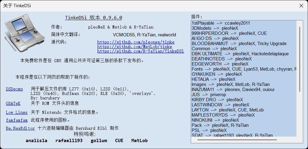 TinkeDSi 是一款用于查看、转换和编辑 NDS(i) 游戏文件的软件。你可以查看大量NDS(i) 游戏文件的有关格式,如图像、文本、音频、字体和纹理。此外,它支持使用 .NET Framework 语言(C# 和 VB.NET)编写的插件,因此非常便于扩展对新格式的支持。
